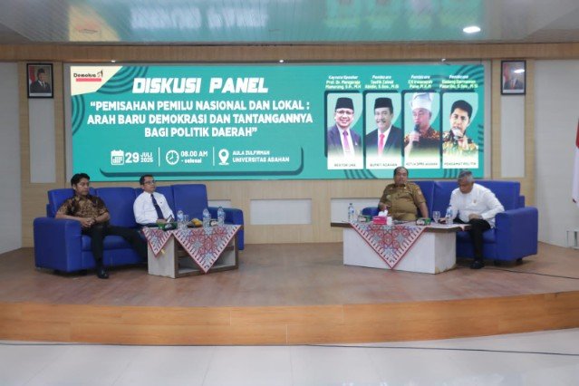 ASAHAN,TEKAPE.co – Bupati Asahan Taufik Zainal Abidin S.Sos, M.Si turut memberikan materi sebagai narasumber dalam diskusi panel pemisahan Pemilu nasional dan lokal di Kabupaten Asahan yang diselenggarakan Lembaga Demokrasi Sumberdaya Insani (DemokraSI) di Aula Zulfirman Universitas Asahan, Selasa (29/07/2025).