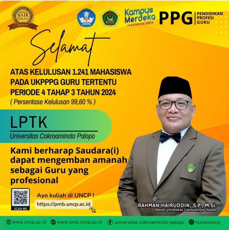 PALOPO, TEKAPE.co – Sebanyak 1.241 mahasiswa Universitas Cokroaminoto Palopo (UNCP) lulus dalam Uji Kompetensi Peserta Pendidikan Profesi Guru (UKPPPG) Guru Tertentu pada Periode 4 Tahap 3 Tahun 2024.