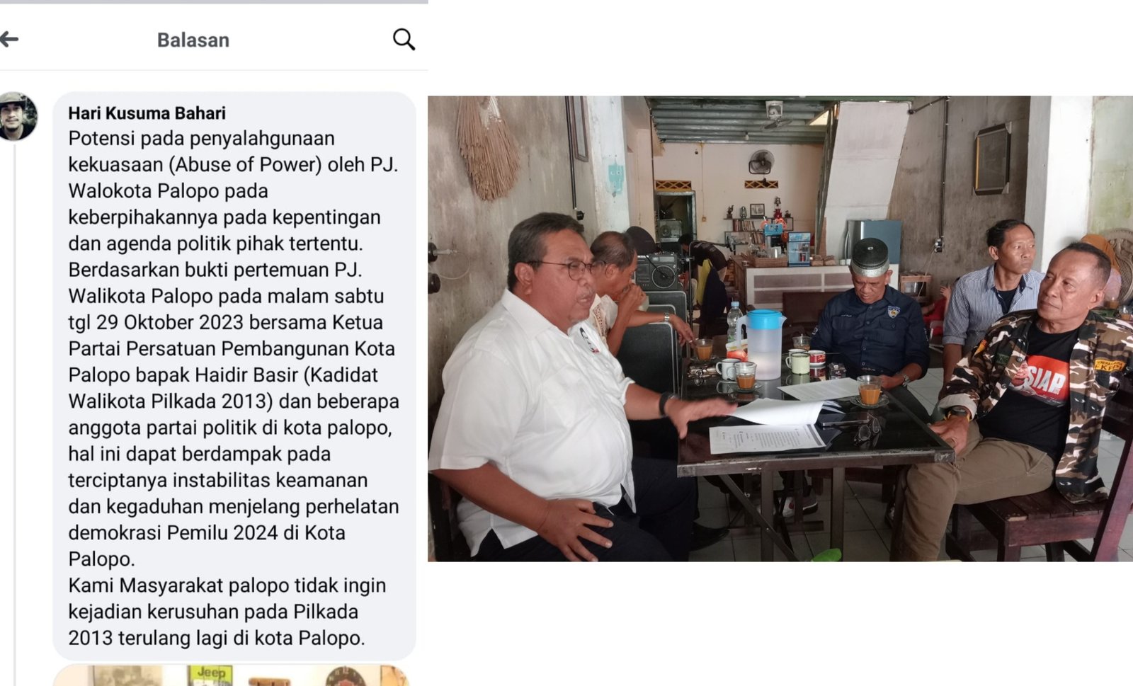 “Berdasarkan bukti pertemuan Pj Wali Kota pada malam Sabtu, 29 Oktober 2023 bersama Ketua Partai Persatuan Pembangunan, bapak Haidir Basir (Kandidat Wali Kota Palopo Pilkada 2013) dan anggota partai politik Kota Palopo, hal ini dapat berdampak pada stabilitas keamanan dan kegaduhan menjelang perhelatan demokrasi Pemilu 2024. Kami masyarakat Kota Palopo tidak ingin kejadian 2013 terulang lagi di Kota Palopo,” tulis akun Hari Kusuma Bahari.