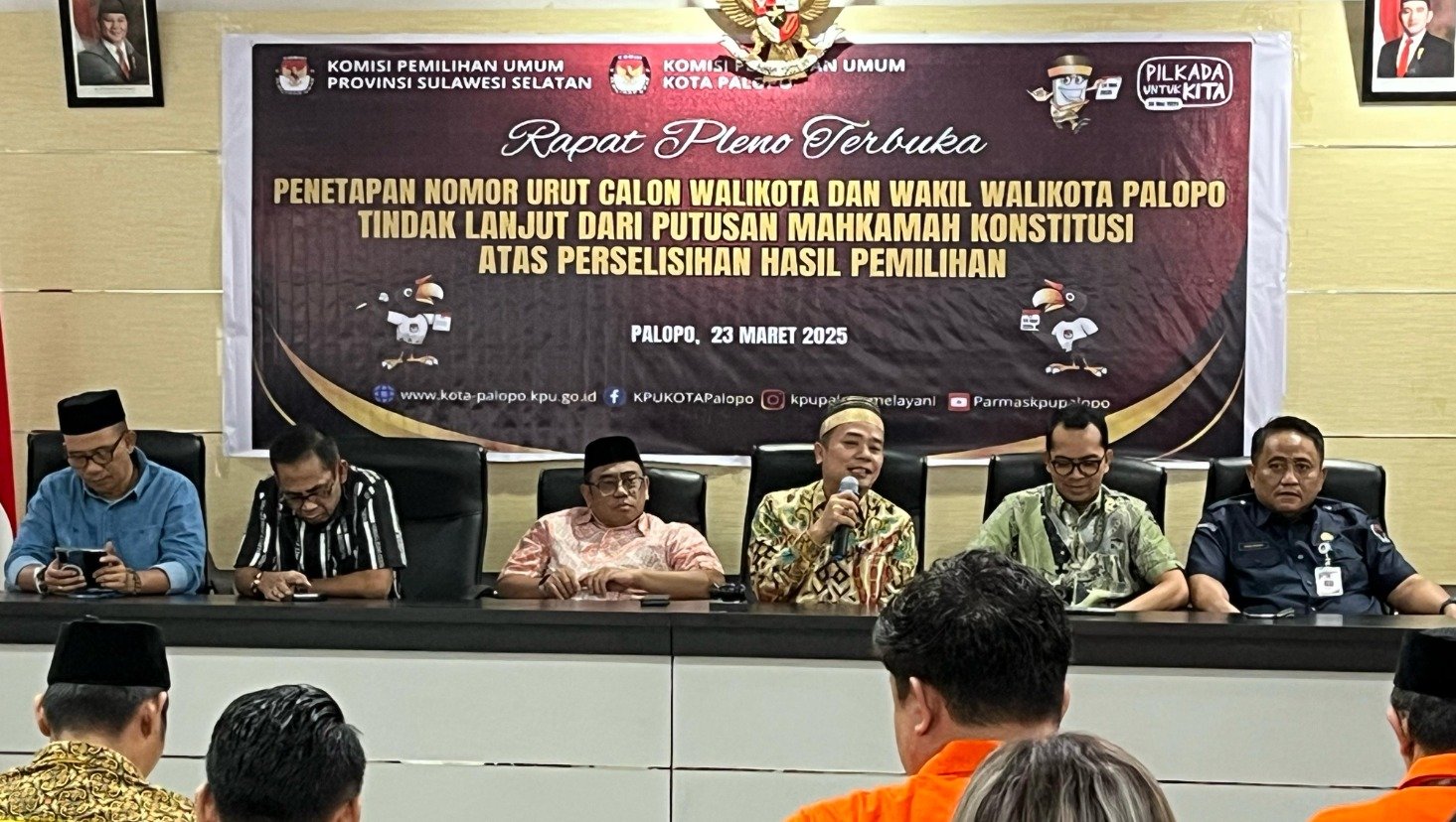 Rapat pleno yang dipimpin Ketua KPU Sulawesi Selatan, Hasbullah, ini turut dihadiri oleh komisioner KPU Palopo, perwakilan pasangan calon, serta sejumlah pejabat terkait.