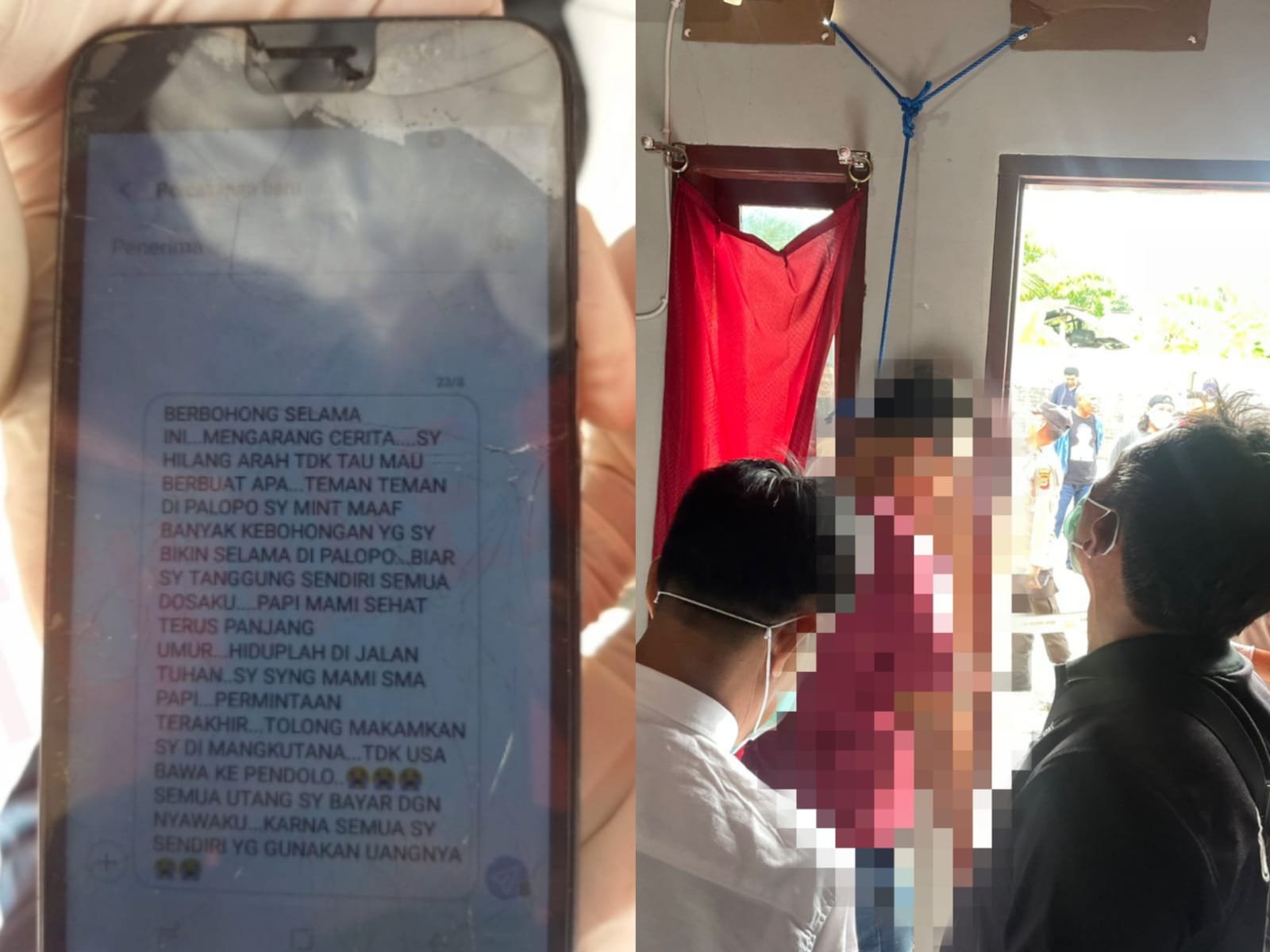 Dalam hanphone terdapat pesan yang yang intinya berisi permintaan maaf kepada keluarganya bahwa terpaksa mengakhiri hidup karena terlilit utang.