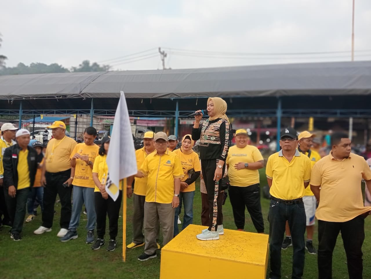 Ketua DPD II Partai Golkar, Hj Warda Dg Mamala SE, melepas peserta jalan sehat dalam rangka memeriahkan HUT ke - 59 Partai Golkar, dengan mengambil start di Lapangan Morokoa Kolonodale, Sabtu 21 Oktober 2023 pagi. (ronal/tekape.co)