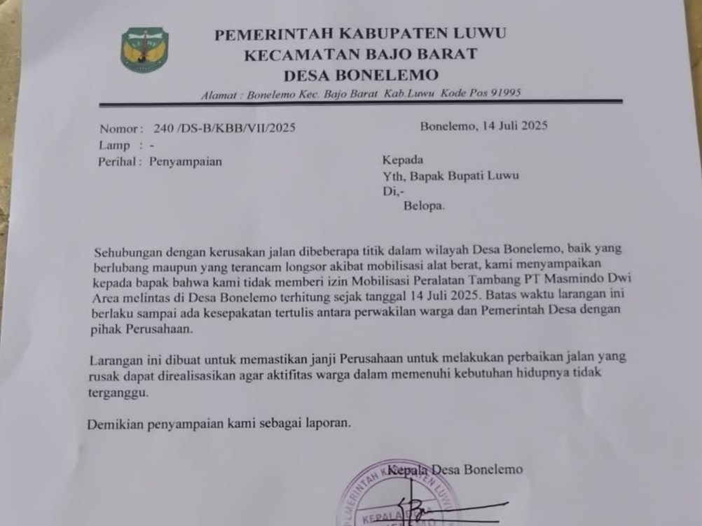 “Kami menyampaikan kepada bapak bahwa kami tidak memberi izin Mobilisasi Peralatan Tambang PT Masmindo Dwi Area melintas di Desa Bonelemo terhitung sejak tanggal 14 Juli 2025,” tulis Kepala Desa Bonelemo, Baso S.H, dalam suratnya.