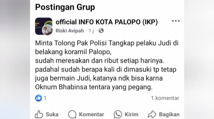 Namun postingan salah satu akun Facebook bernama Riski Avipah pada grup facebook official Info Kota Palopo, Minggu 17 November 2024, memposting tulisan adanya aktifitas judi.