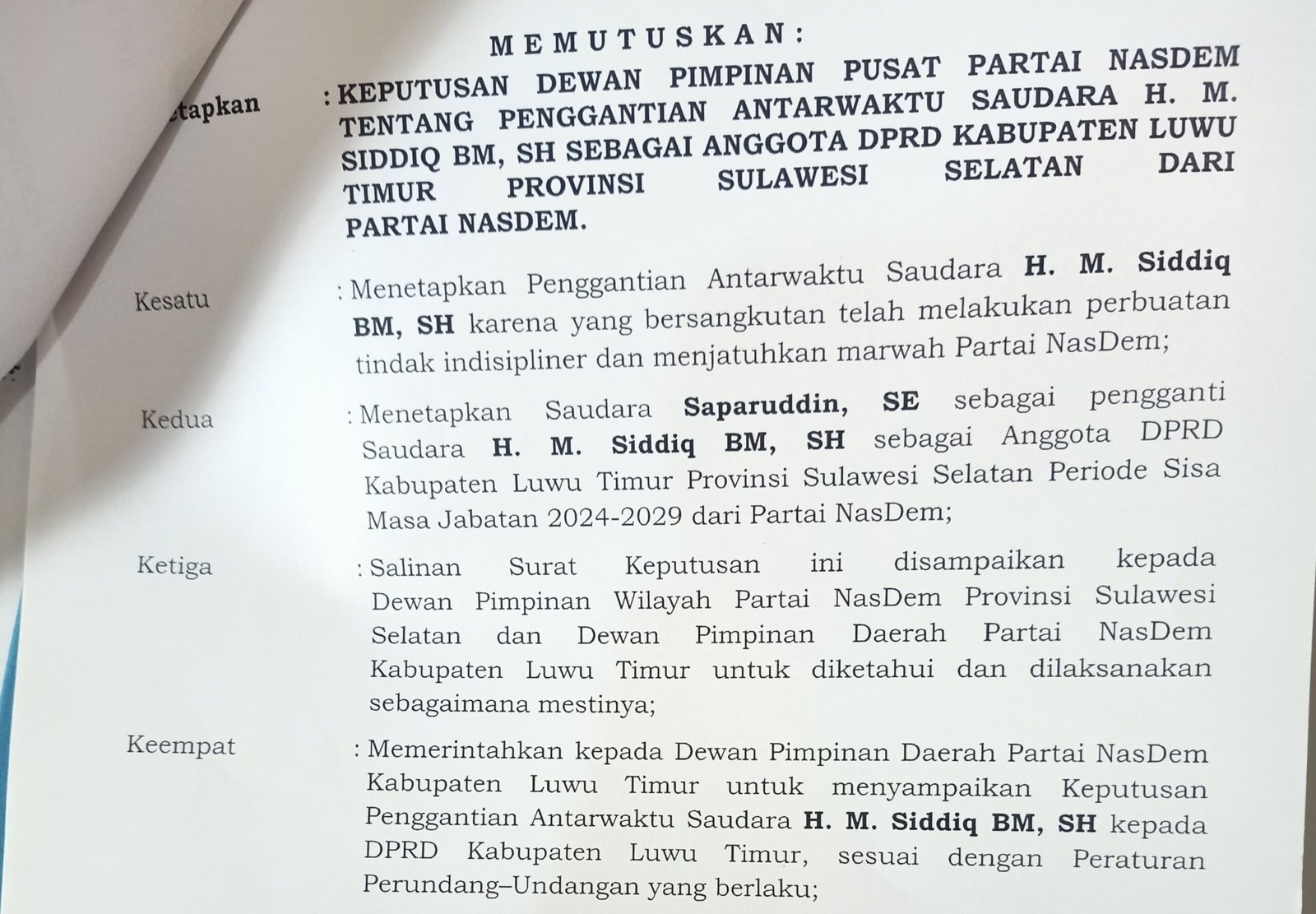 “Menetapkan penggantian antarwaktu Saudara HM Siddiq BM karena yang bersangkutan telah melakukan perbuatan indisipliner dan menjatuhkan marwah Partai NasDem,” demikian kutipan dalam SK tersebut.