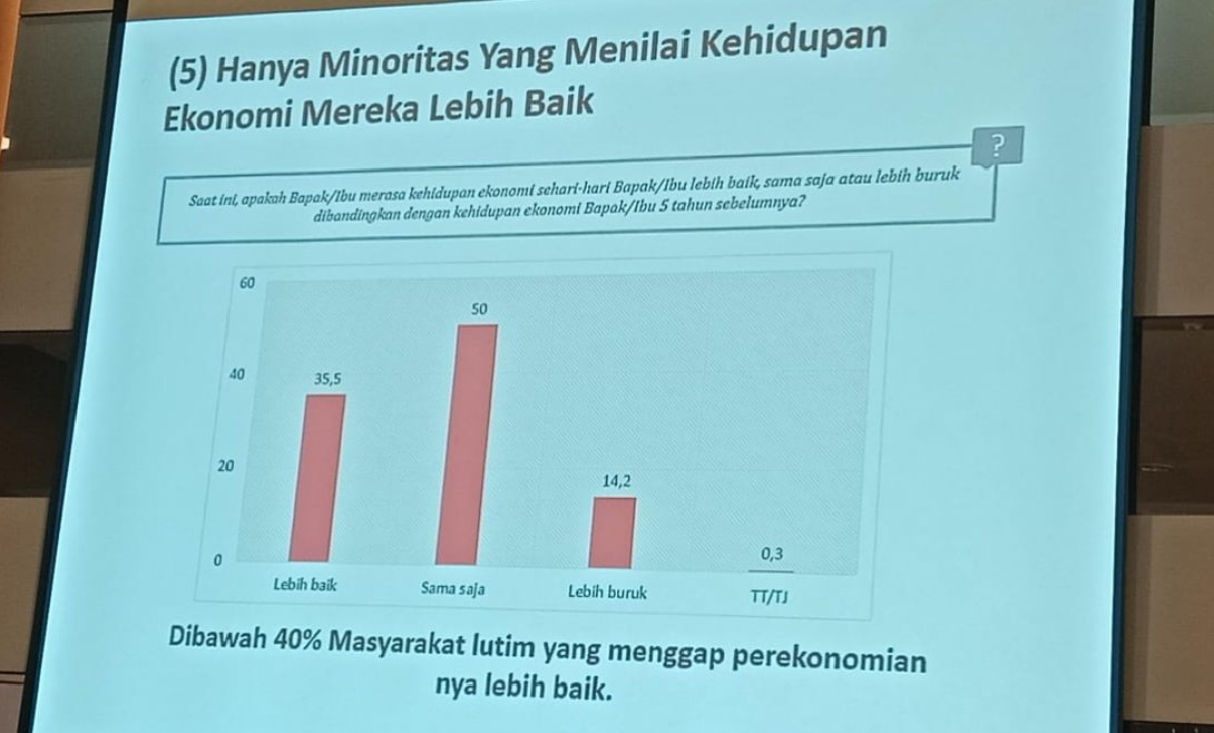Sementara itu, dari sektor ekonomi, sebanyak 50% responden menilai tak ada peningkatan selama Lutim dipimipin Budiman-Akbar. Hanya 35,5% menilai lebih baik, dan 14,2% menilai lebih buruk. (Rls)