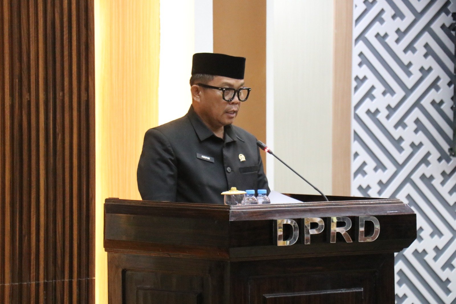 Juru Bicara Fraksi Golkar, Aripin S.Ag MH, dalam rapat paripurna pendapat akhir fraksi terhadap Ranperda Perubahan APBD Tahun Anggaran 2025, Jumat (22/8/2025). (hms)